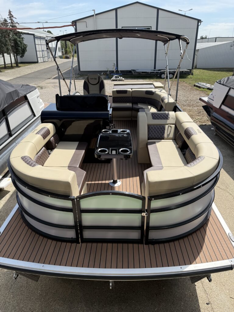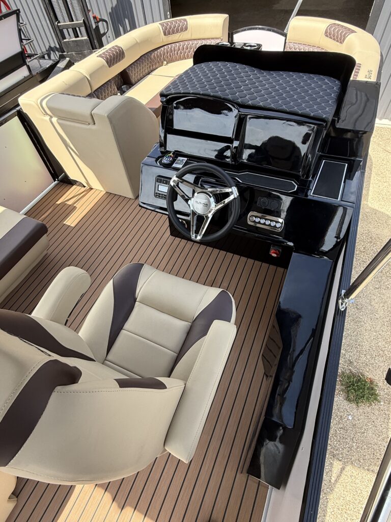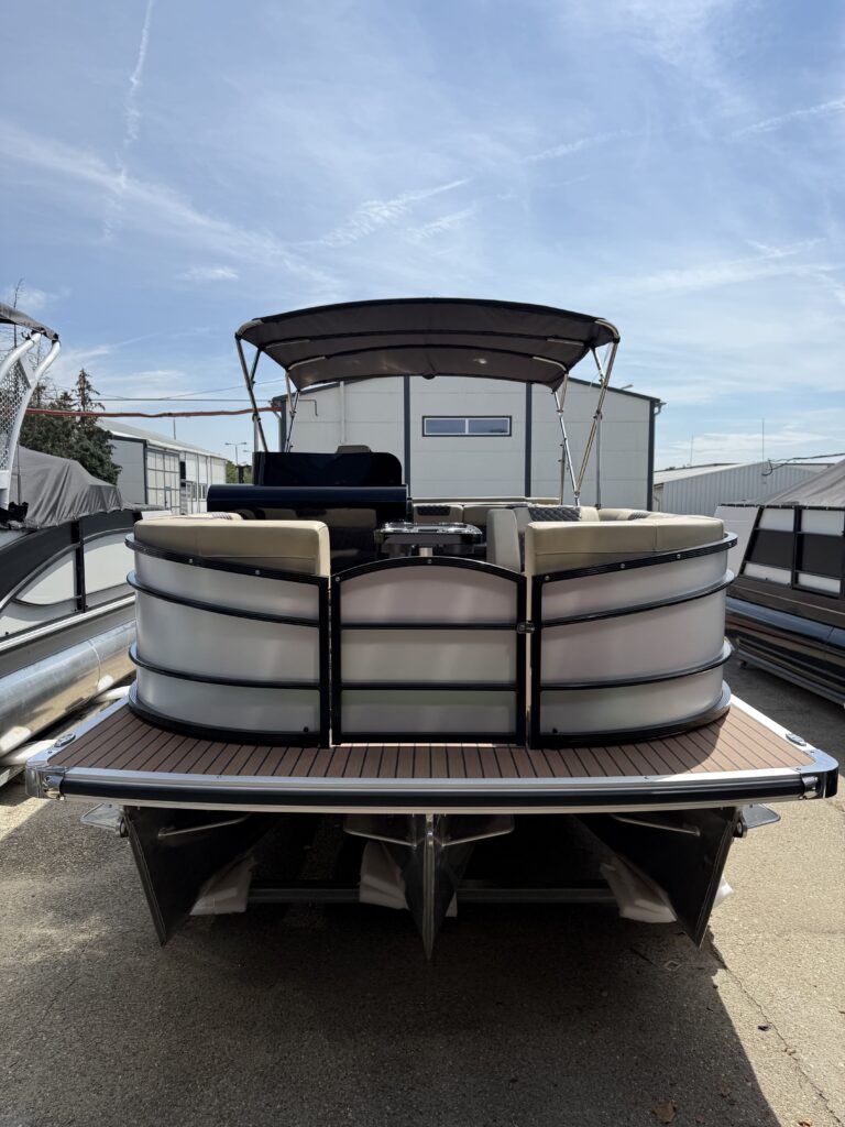 Customizable exterior paint finish Choice of interior upholstery and flooring Hertz audio system with 4 x 6.5" standard speakers Stainless steel swim ladder 90L fuel tank Cup holders 1 standard table Required navigation lights Analog gauges Three standard pontoon hulls Standard captain's helm Dyno 12V 100Ah battery Victron Energy 13A IP65 charger Furrion shore power connector 12V USB phone charger Cable-driven steering system